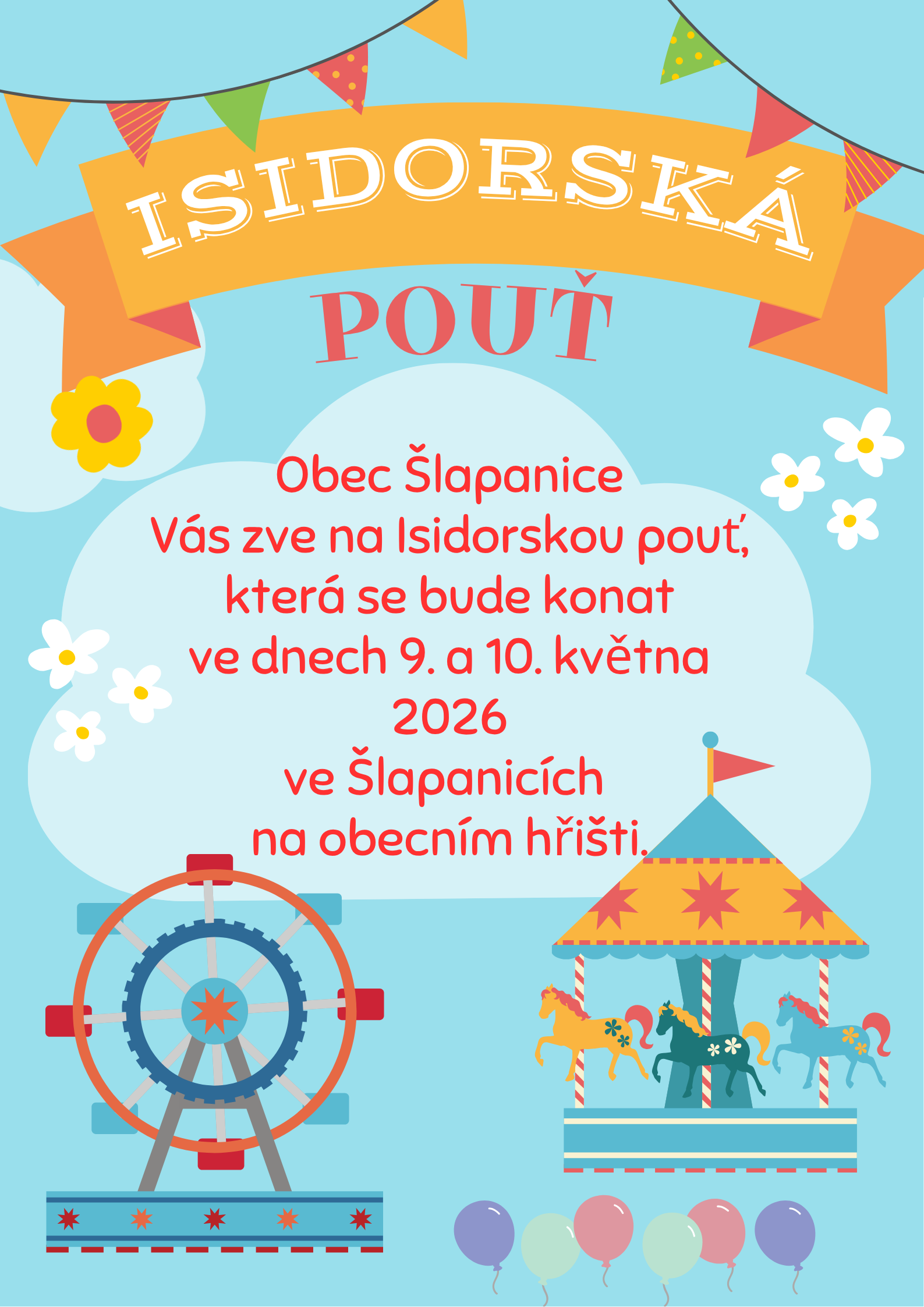 Srdečně Vás zveme na Isidorskou pouť, která se bude konat ve dnech 9. a 10. května 2026 na obecním hřišti.